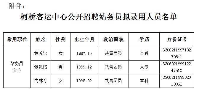 紹興柯橋客運中心有限公司因工作需要,經國資辦批準面向社會公開招聘基層類崗位站務員3人,通過筆試、面試、素質考察、體檢、政審考察等程序后,擬錄用黃蘇爾等3位同志。現予以公示,并就有關事項通告如下: