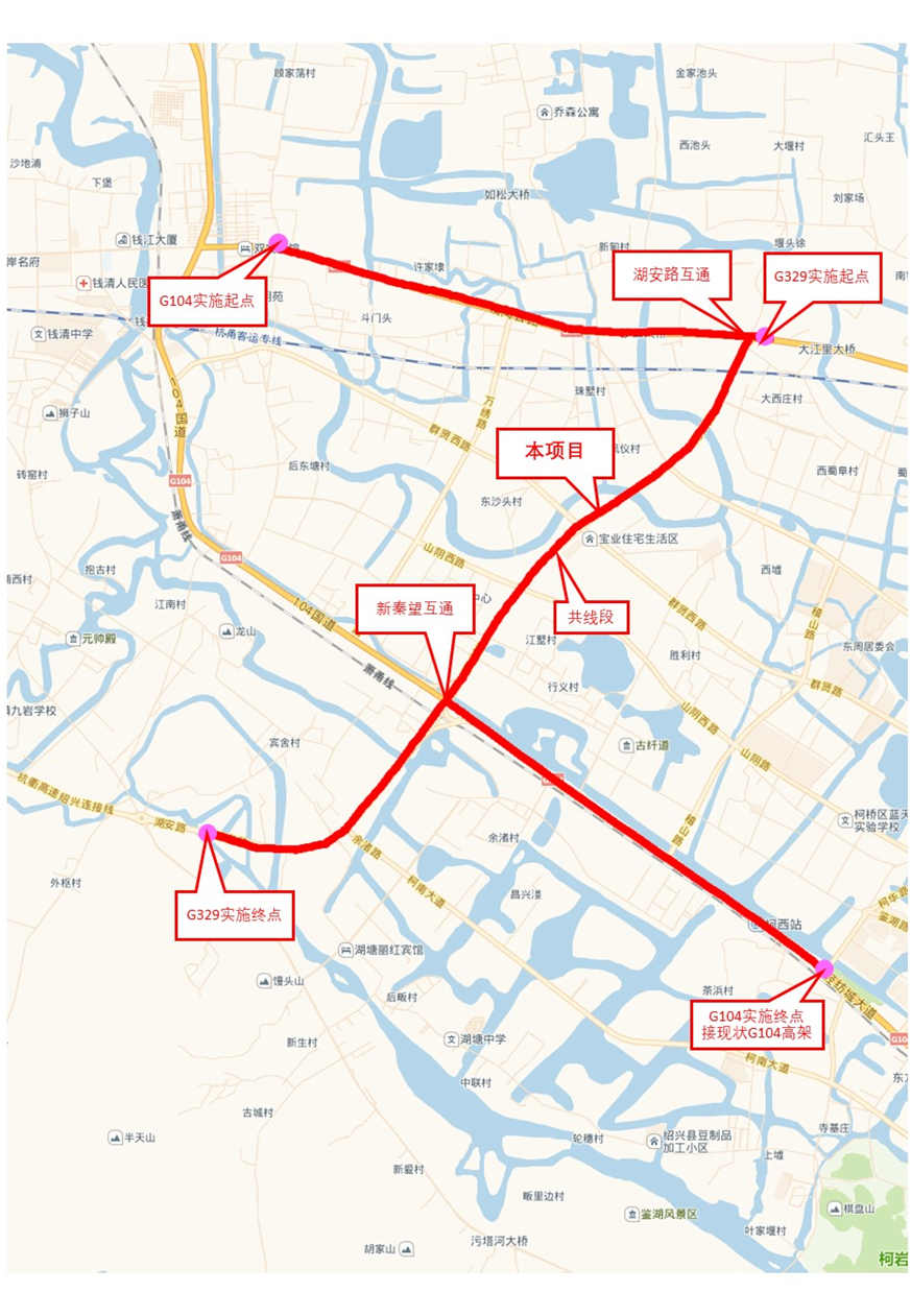 本項目湖安路高架段(329高架)起點位于329國道與杭金衢高速紹興連接線(湖安路)交叉口處,在湖安路互通至新秦望互通利用新建錢陶線-輕紡城大道高架段(104高架),過新秦望互通后高架并回杭金衢高速紹興連接線,終點為距杭金衢高速紹興連接線與楊紹線交叉口約700m處,路線全長6.551km,其中與104高架共線約4.217km。