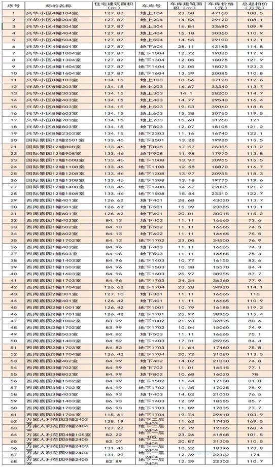 興華小區(qū)、國際景園、西周嘉園、萬家人利花園共計(jì)68套住宅,建筑面積約:82.07㎡至134.15㎡不等,起拍價(jià)73.6萬元至174萬元不等。